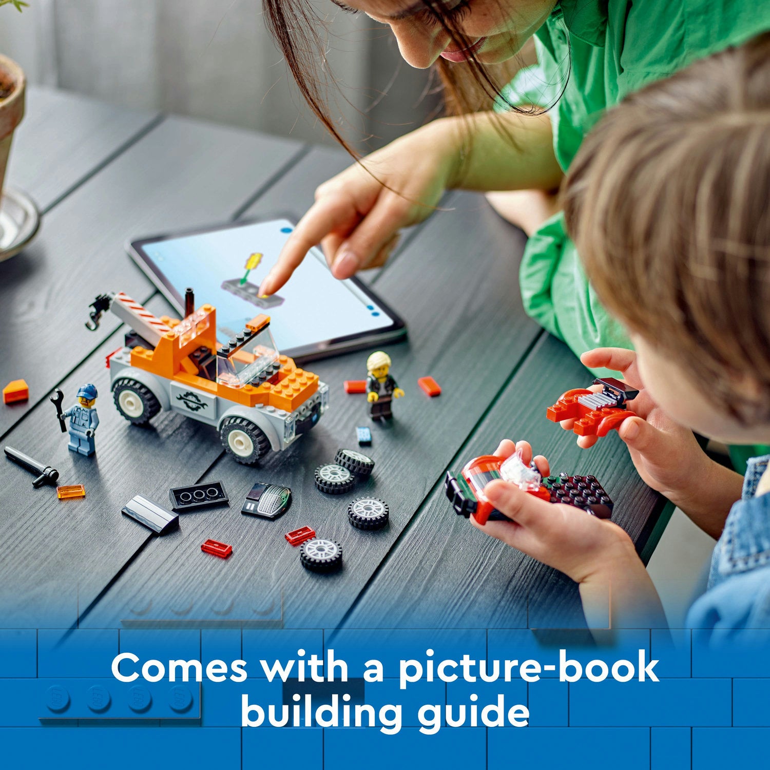 - LEGO® minifigure accessories – This toy vehicle recovery playset comes with accessories for pretend play, including a toy wrench and phone