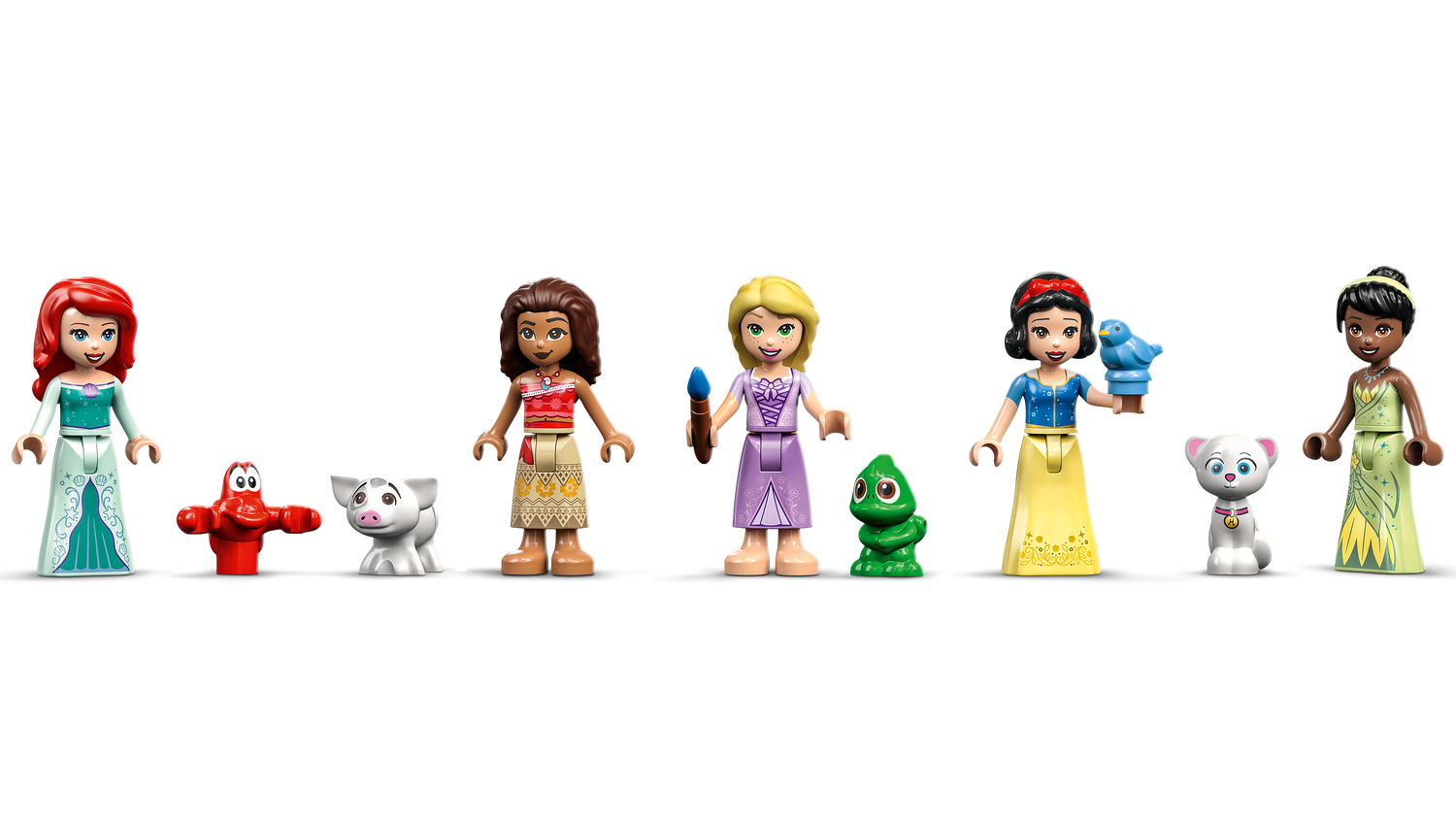 This LEGO ǀ Disney Princess castle playset features a buildable castle toy with 4 levels and 5 bedrooms, an animal playground and a heart-shaped key. Also included are 5 LEGO | Disney Princess mini doll figures: Ariel, Moana, Rapunzel, Snow White and Tiana, plus 5 LEGO animal figures and loads of cool elements and accessories like a celebration cake, a paintbrush, guitar, apple, basket, brush, lantern, pots and flowers elements.