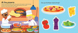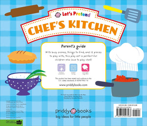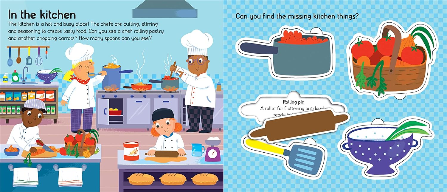 With a saucepan, spatula, pizza base and toppings, children will have fun rustling up a pretend meal, while the illustrated board book shows chefs in the kitchen using utensils and making meals, with fun things to find.