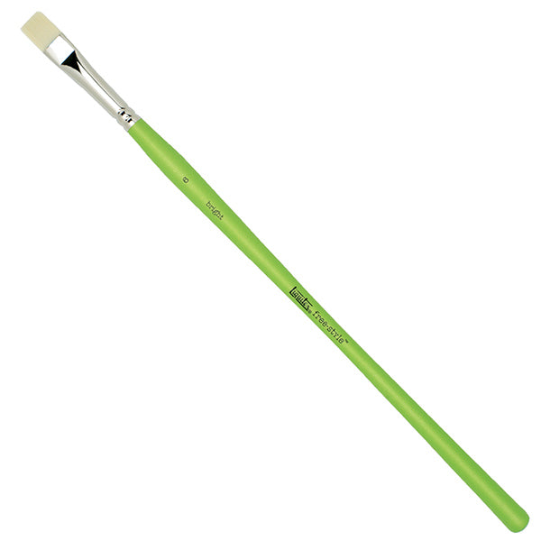 A professional long-handled brush with a short, flat bristle head and slightly contoured tip. Great for short, controlled strokes, the sustainable nylon filaments have the ideal spring and snap for acrylic media, while the weighted handle is ergonomically designed for balance and comfort.
