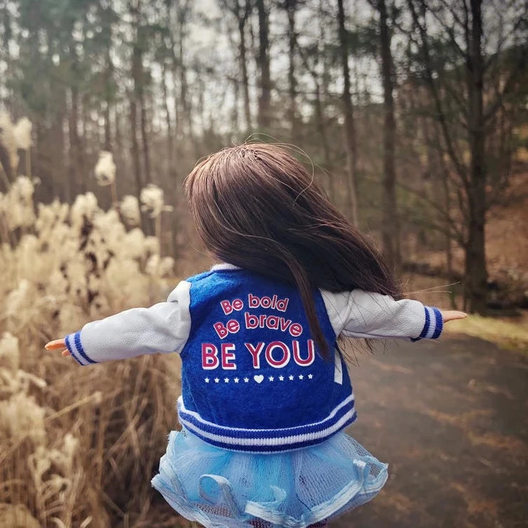 - A vintage-style Varsity jacket featuring the ‘Be Bold Be Brave Be You’ print on the back
