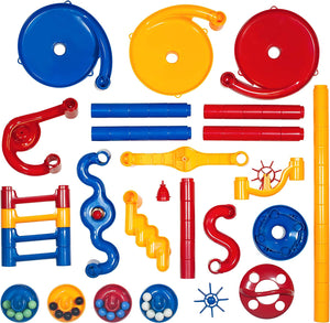 Includes starter top and base, 3 racing vortex, wiggly chute, staircase, horizontal and vertical wheels, 20 marbles, and more