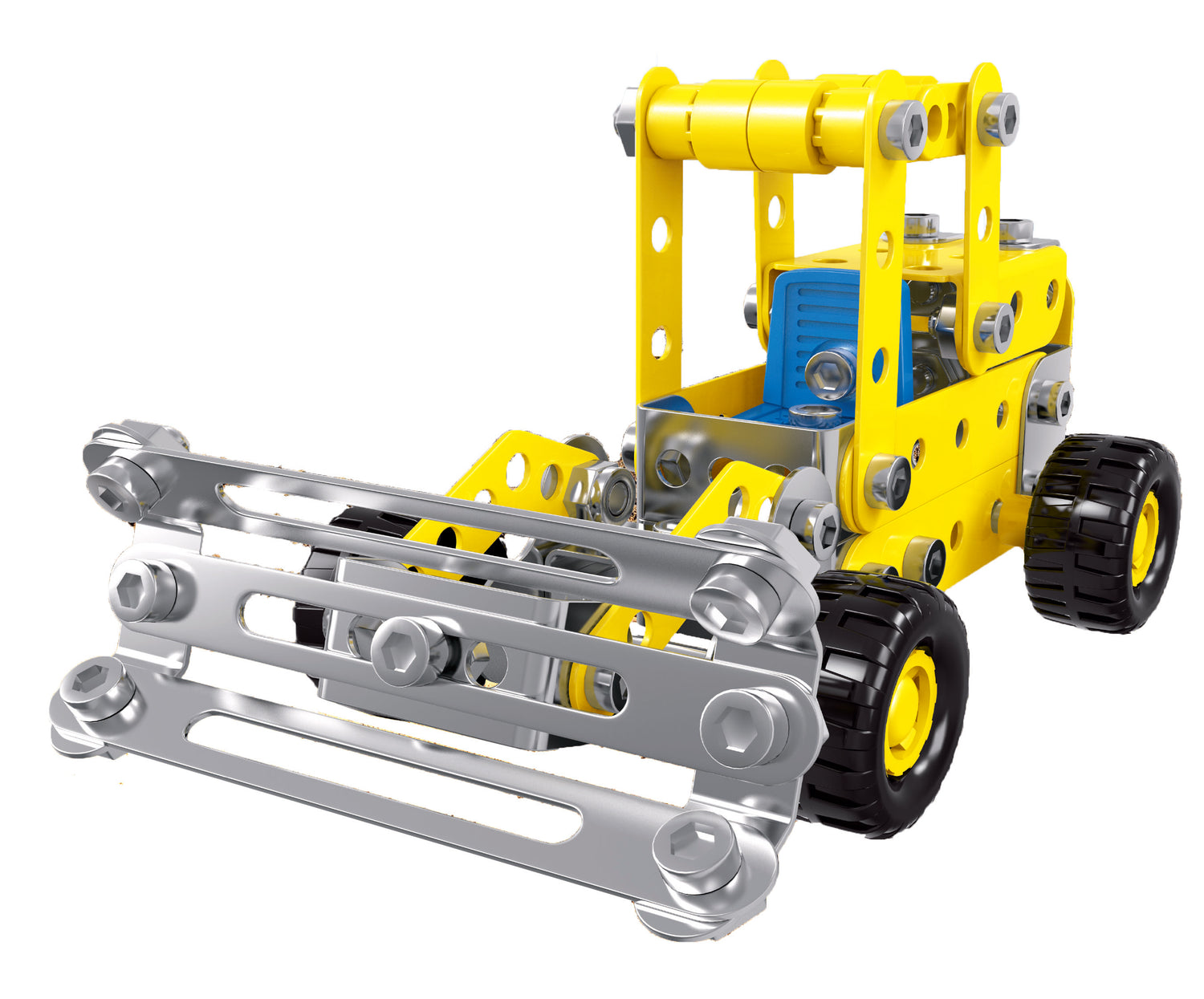 180 piece metal construction set with some plastic parts and a hex key and mini spanner. Makes 7 models.