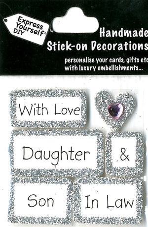 A gorgeous range of glitter finished stick on adhesive toppers from the popular Express Yourself DIY Range.