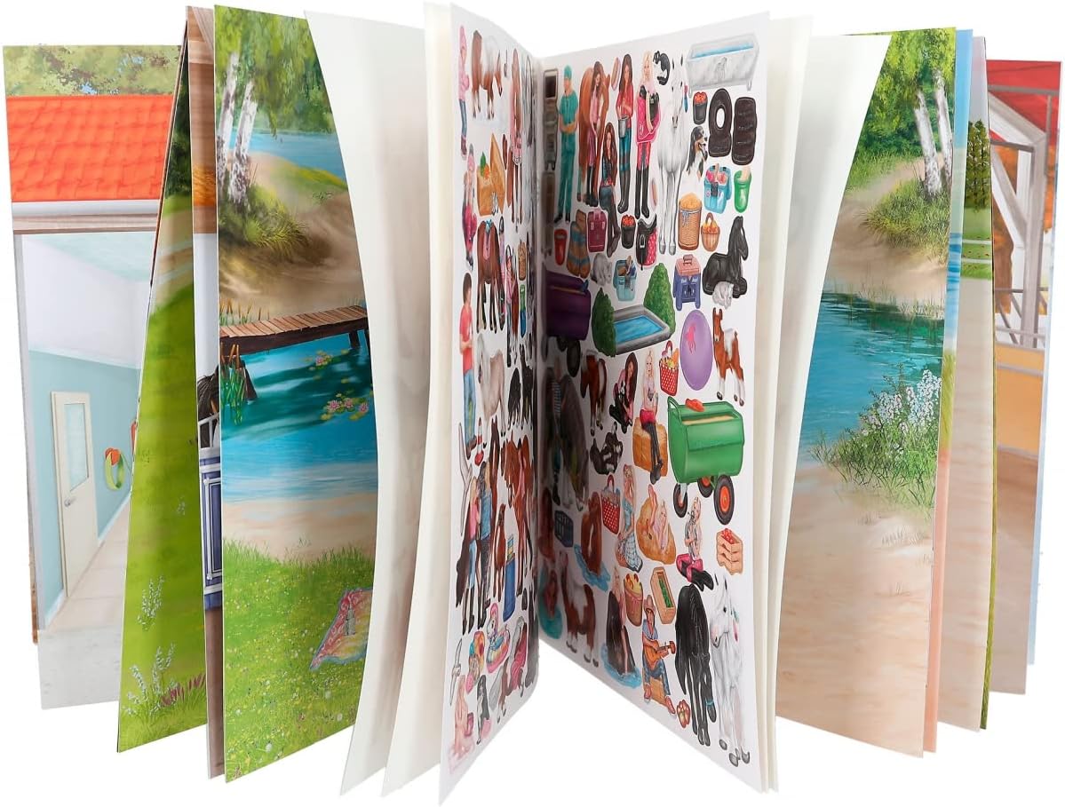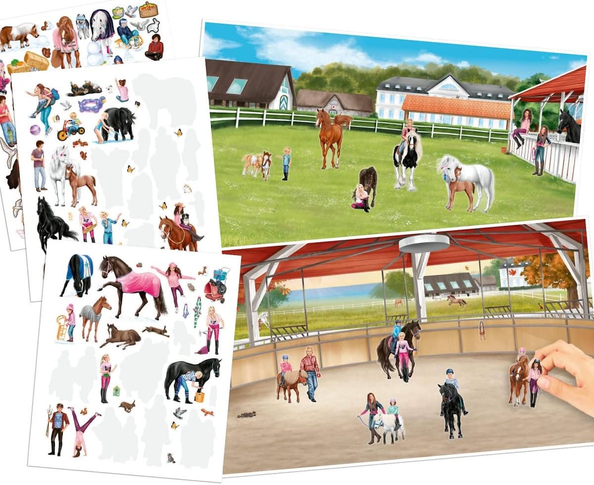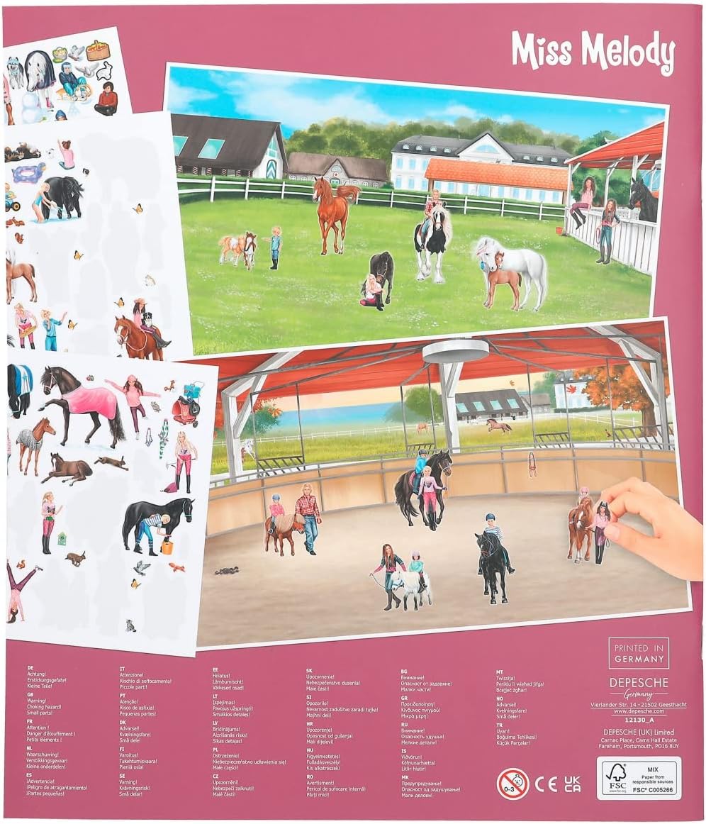 Miss Melody Stickerworld by Depesche offers 24 pages of pre-printed backgrounds featuring detailed scenes and landscapes related to horse paddocks, riding equipment, and jumping tournaments.