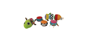 - Gently shake caterpillar to hear chimes and rattles to capture baby’s attention
