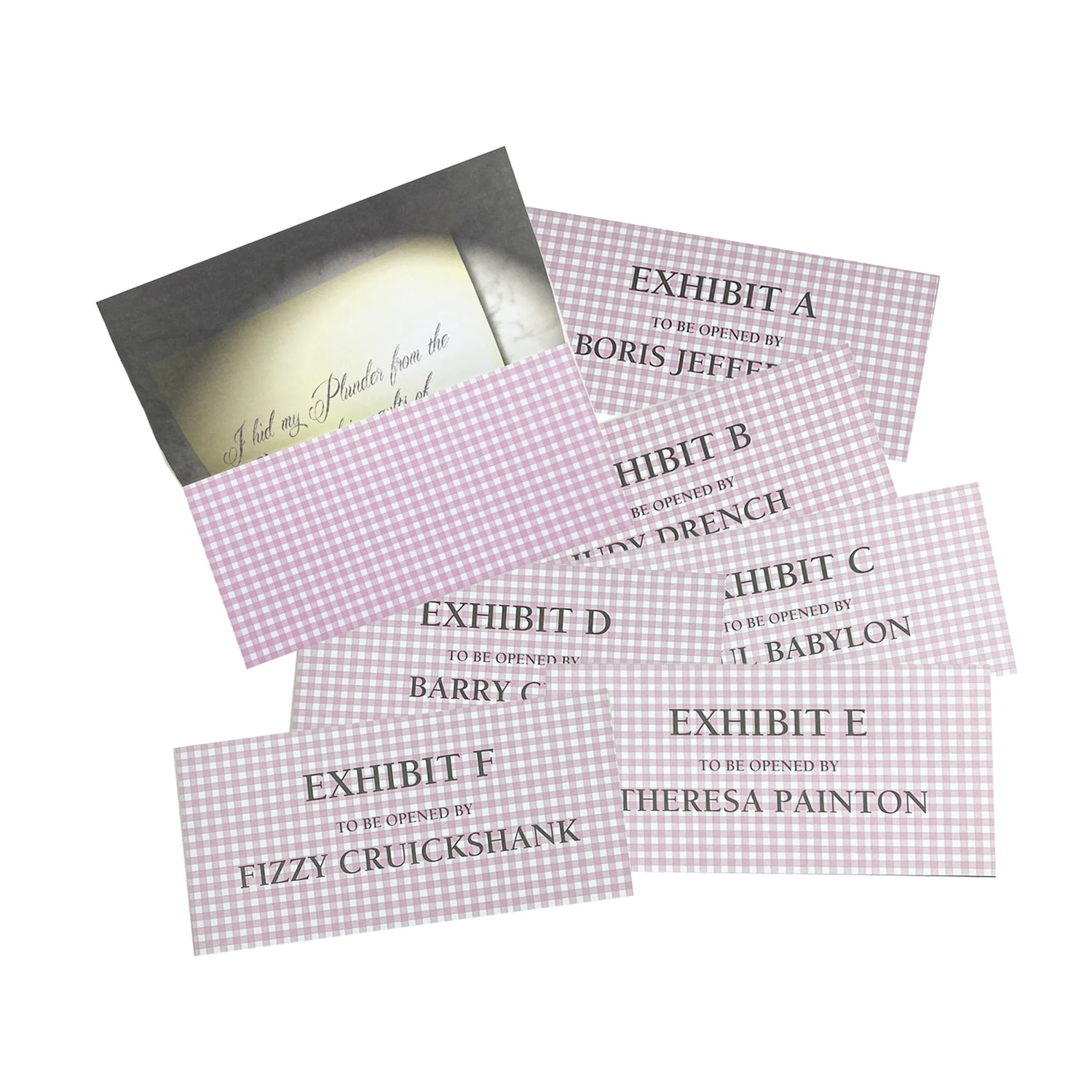A Slice of Murder Dinner Party game comes complete with game rules, recipes and decorating tips. Invitations for each of the characters are also included complete with booklets about their roles, background information, and even a few tasty secrets.