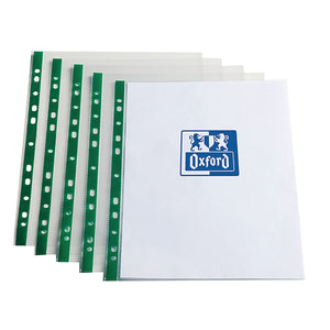 Oxford A4 Clear Punch Pocket. Protects files with clear visibility of documents. Featuring green, reinforced, punched spines and suitable for ringbinders and lever arch files. Colour: Clear.