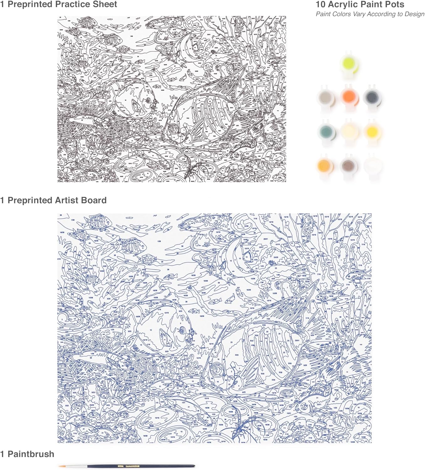 Each project includes a preprinted artist board, practice sheet, acrylic paints, brush and instructions.