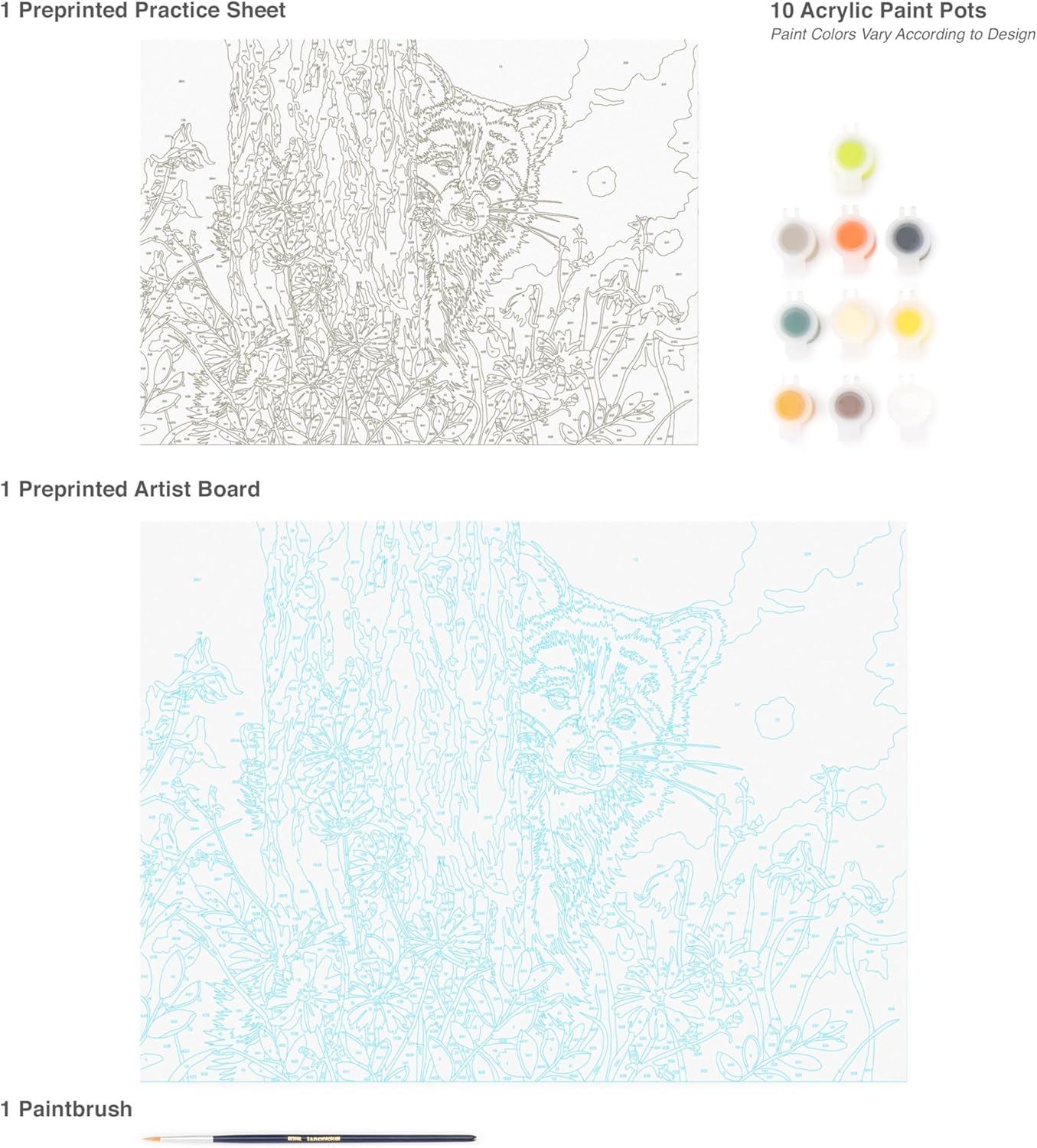 Each project includes a preprinted artist board, practice sheet, acrylic paints, brush and instructions.