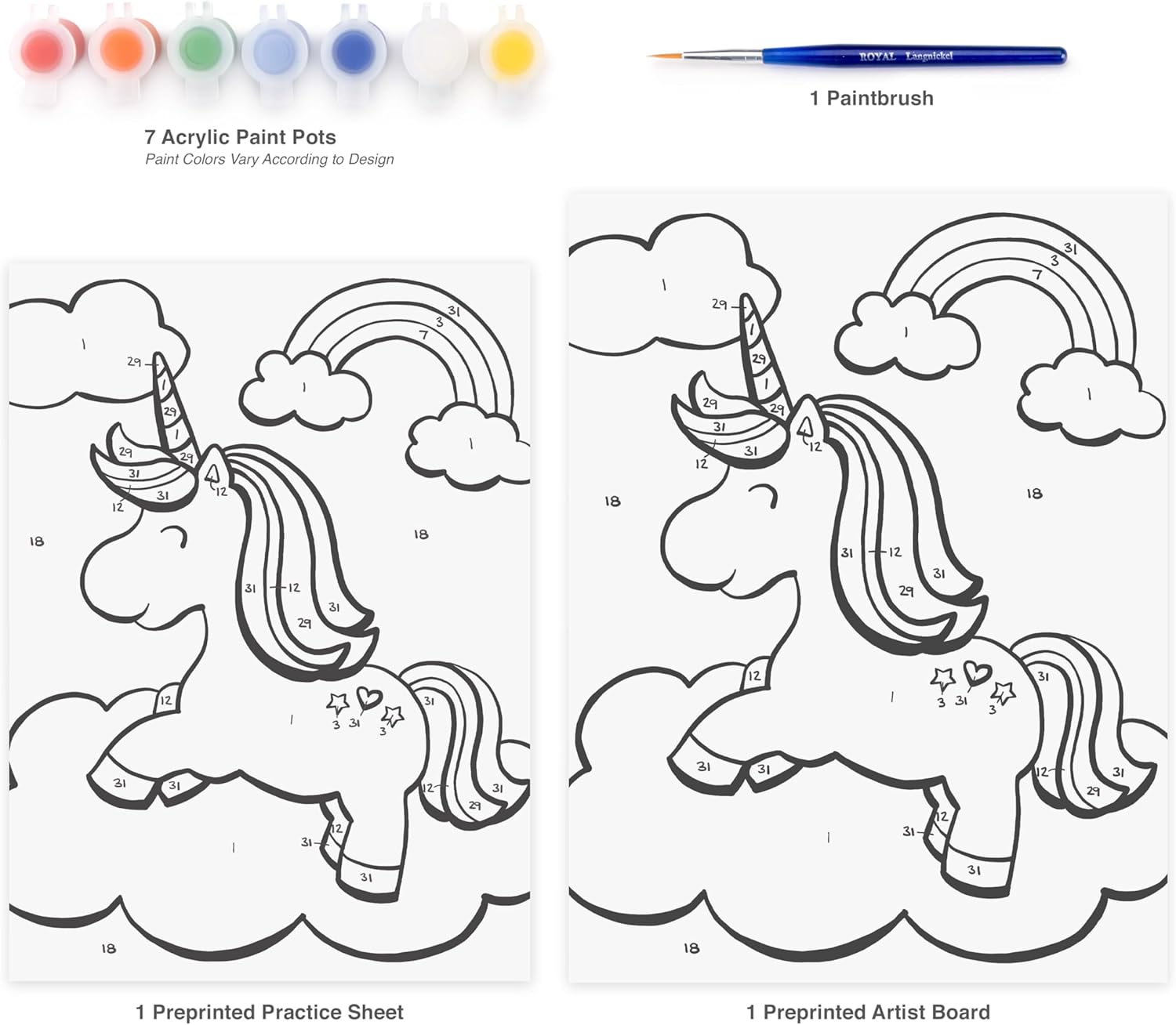 - Includes: 7 Paint Pots, 1 Preprinted Board, 1 Preprinted Practice Sheet, and 1 Paint Brush