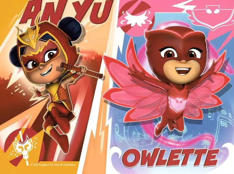 The 12 piece puzzle features Gekkko and Newton Star, 16 piece; An Yu and Owlette, 20 piece Catboy battles against villains Romeo, Night Ninja and Luna Girl. Finishing with a 24 piece showing the favourite heroes together; Catboy, Owlette, Gekko, Newton Star, Lily Fay, Ice Cub and An Yu.