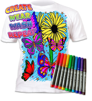 This Butterflies Colour in splat shirt is perfect for older kids with a lot of detail. They can colour in this t-shirt over and over again.