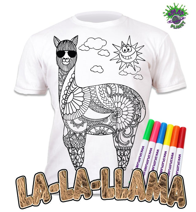 This llama colour in splat shirt is a one of our most popular designs. Kids can colour in this t-shirt over and over again.