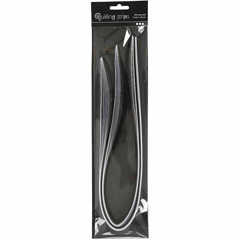 Paper strips suitable for quilling, which can be shaped into fine patterns to decorate cards, decorations etc.