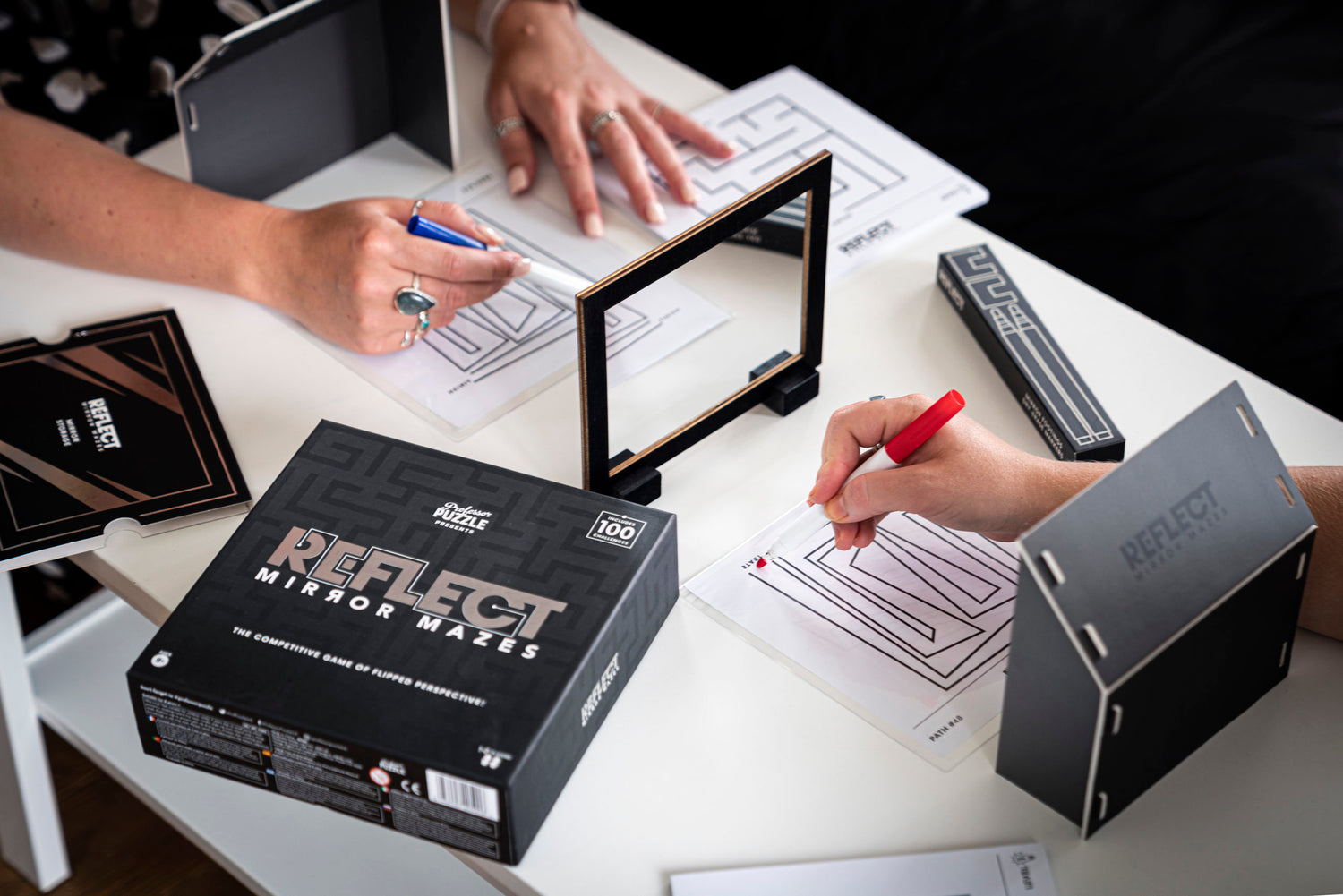 Each player has a notepad of challenges. The double-sided mirror is placed between the two players, and their hands are hidden from sight by the hand guards.