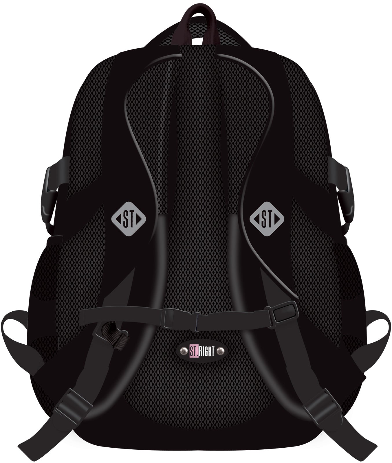 This black St.Right backpack with a K-pop finger heart design, features soft and adjustable shoulder straps with profiled, ergonomic back support and additional stiffening.