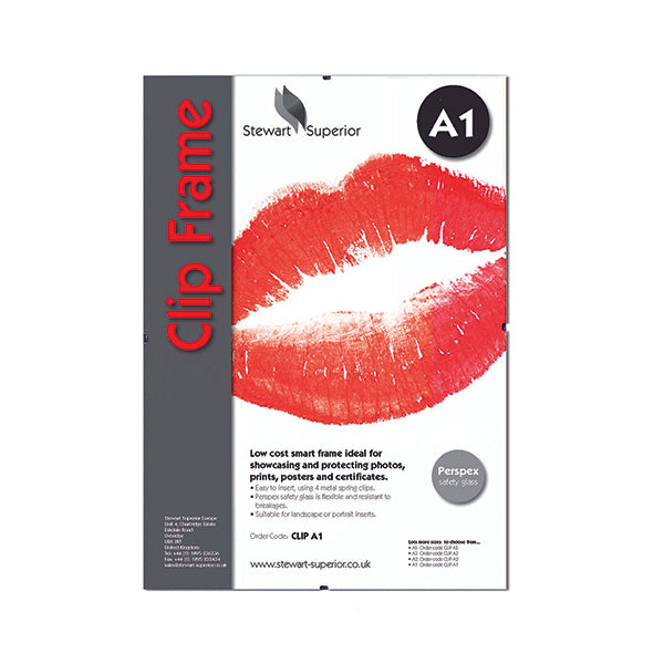 Seco Clipframe A1 CLIPA1. Size: A1. Break-resistant cover. Metal clips to hold contents in place. Ideal for displaying photos, posters and certificates. Clear front with hardboard back.