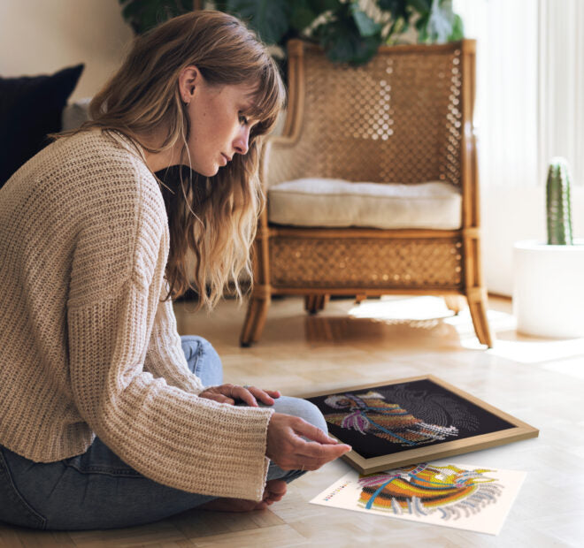 - In the box: Coloured Sequins, Velvet Base, Pins, Instructions, Polystyrene Base and Wooden Frame