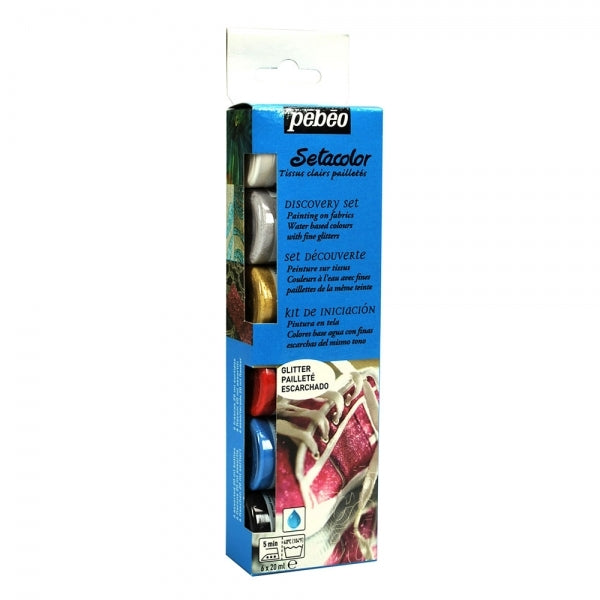 Contains 6 Assorted 20ml Glitter Light Fabrics paints.