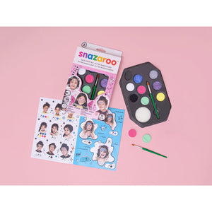 Contains: 2ml white, black, pale yellow, fuchsia pink, pale green, electric silver, sparkle blue and sparkle lilac. Includes a brush, sponge and full colour face painting guide.