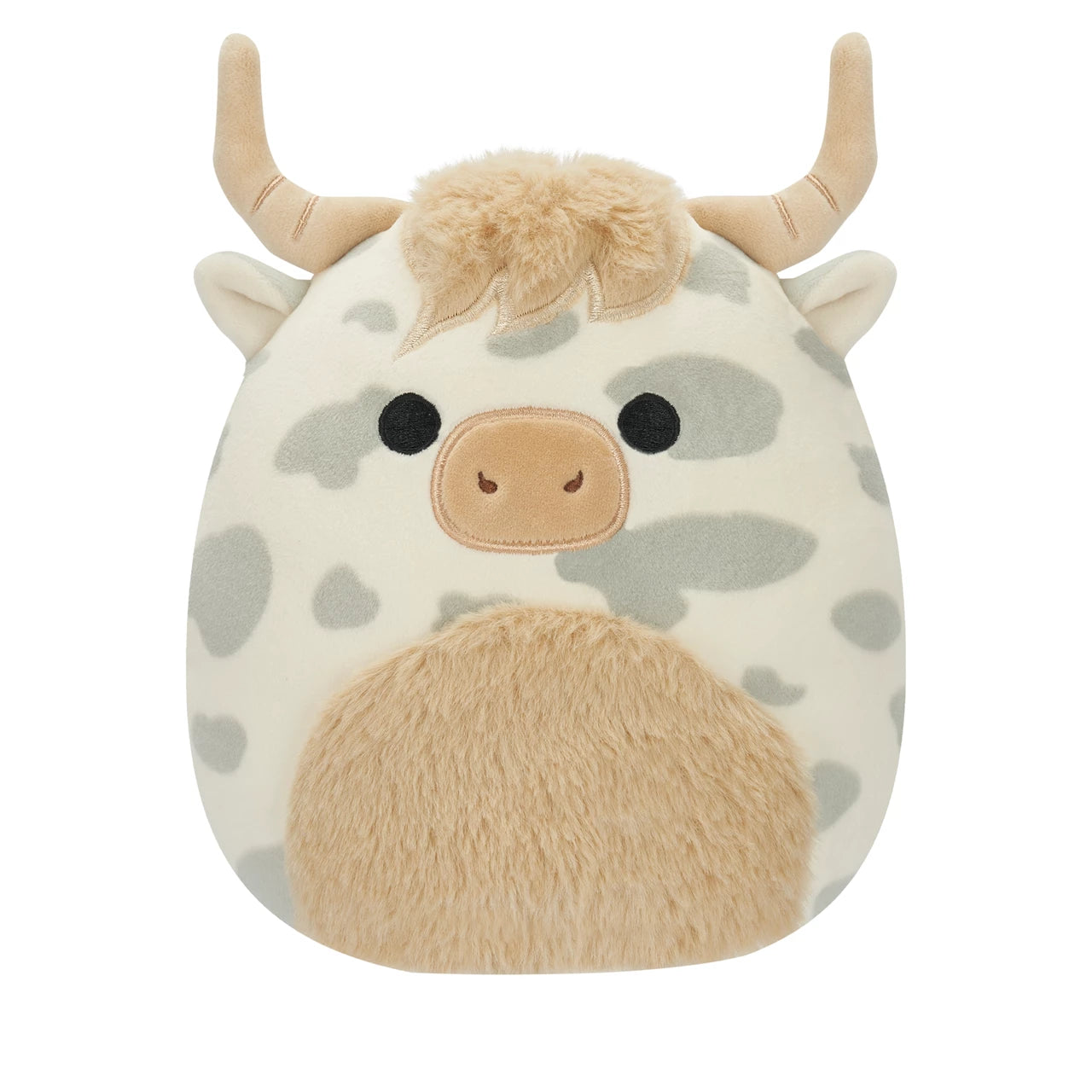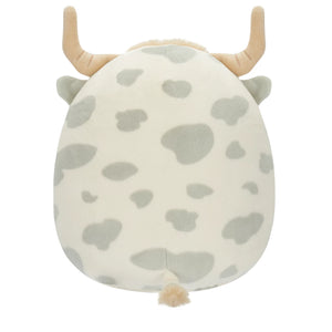 Borsa is a white-coated cow featuring grey spots and fringe of tan fur. His muzzle is tan in color, with white inner ears and a fluffy, tan belly.