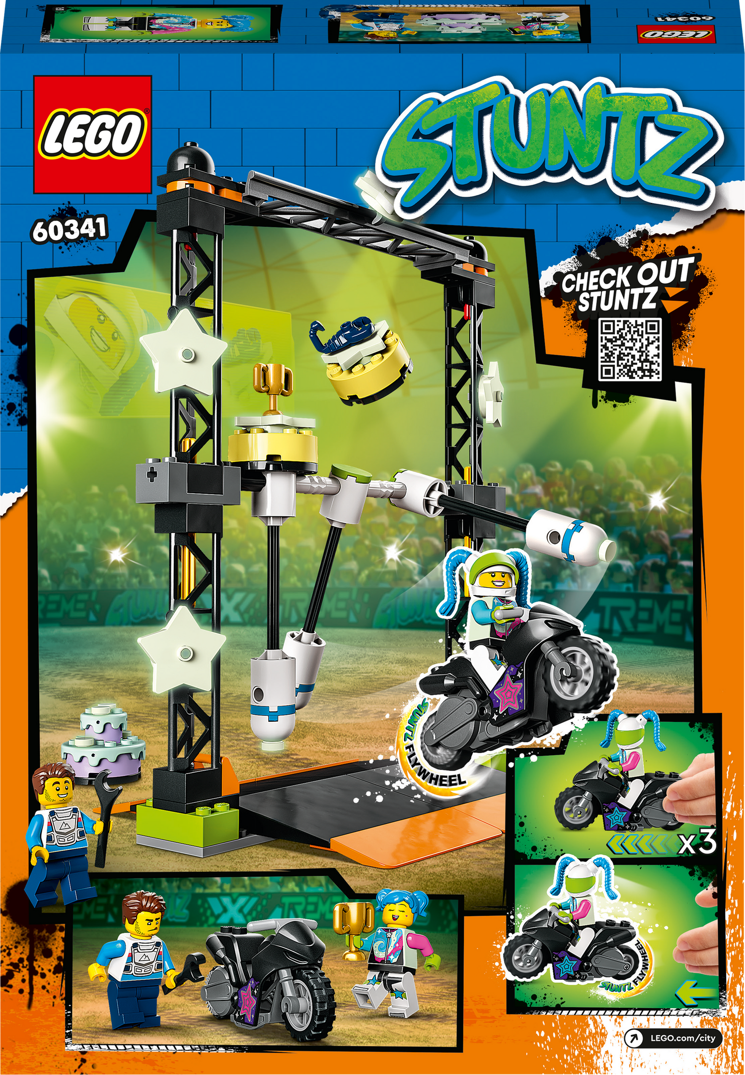 - What’s in the box? – All kids need to build The Knockdown Stunt Challenge, a flywheel-powered stunt bike and LEGO® City Adventures TV series minifigure characters Galactic Poppy Star and Harl Hubbs