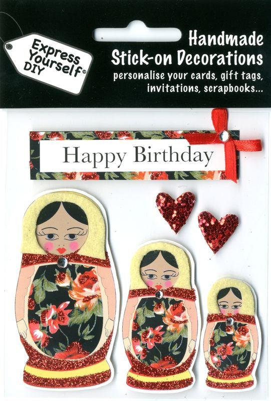 Self-adhesive decorations, handmade using a variety of quality fabrics, ribbons, sequins, diamonds and printed elements.