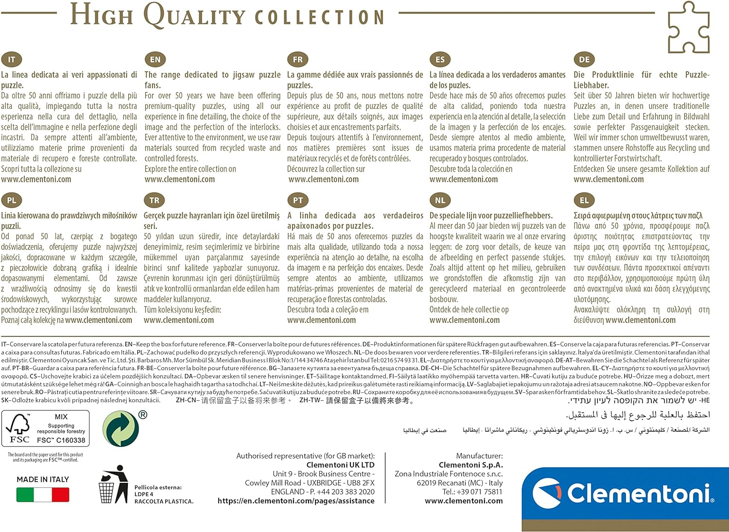 The most striking images, the greatest variety of size and the quality signed Clementoni for a line that is a reference for all puzzle enthusiasts.