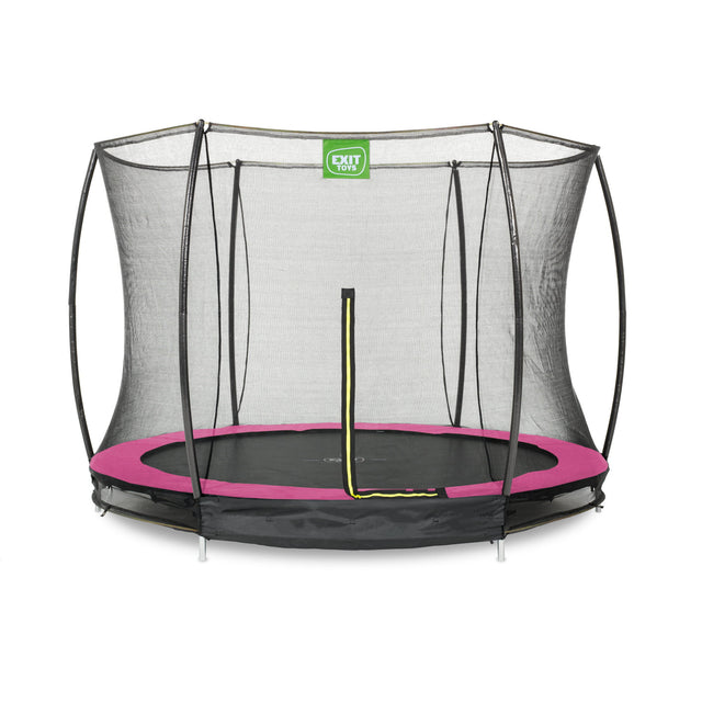 The EXIT Silhouette ground trampoline, designed for ages 3 and up, is a small rectangular trampoline featuring a pink padding.