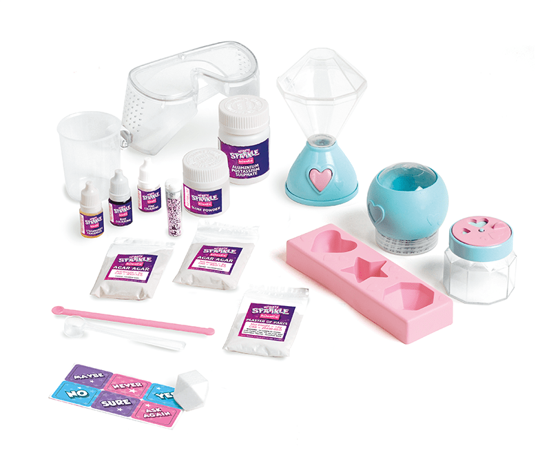- Contents: Nightlight with colour changing LED (Requires 2 x LR44 batteries – included), room fragrance jar, safety goggles, mystic ball container, Agar-Agar, mystic ball dice and stickers, shower jelly mould, stirrer, measuring scoop, slime powder, aluminium potassium sulphate, biodegradable glitter, blue colouring, pink colouring, plaster of paris, plastic beaker, strawberry fragrance, colour activity guide.
