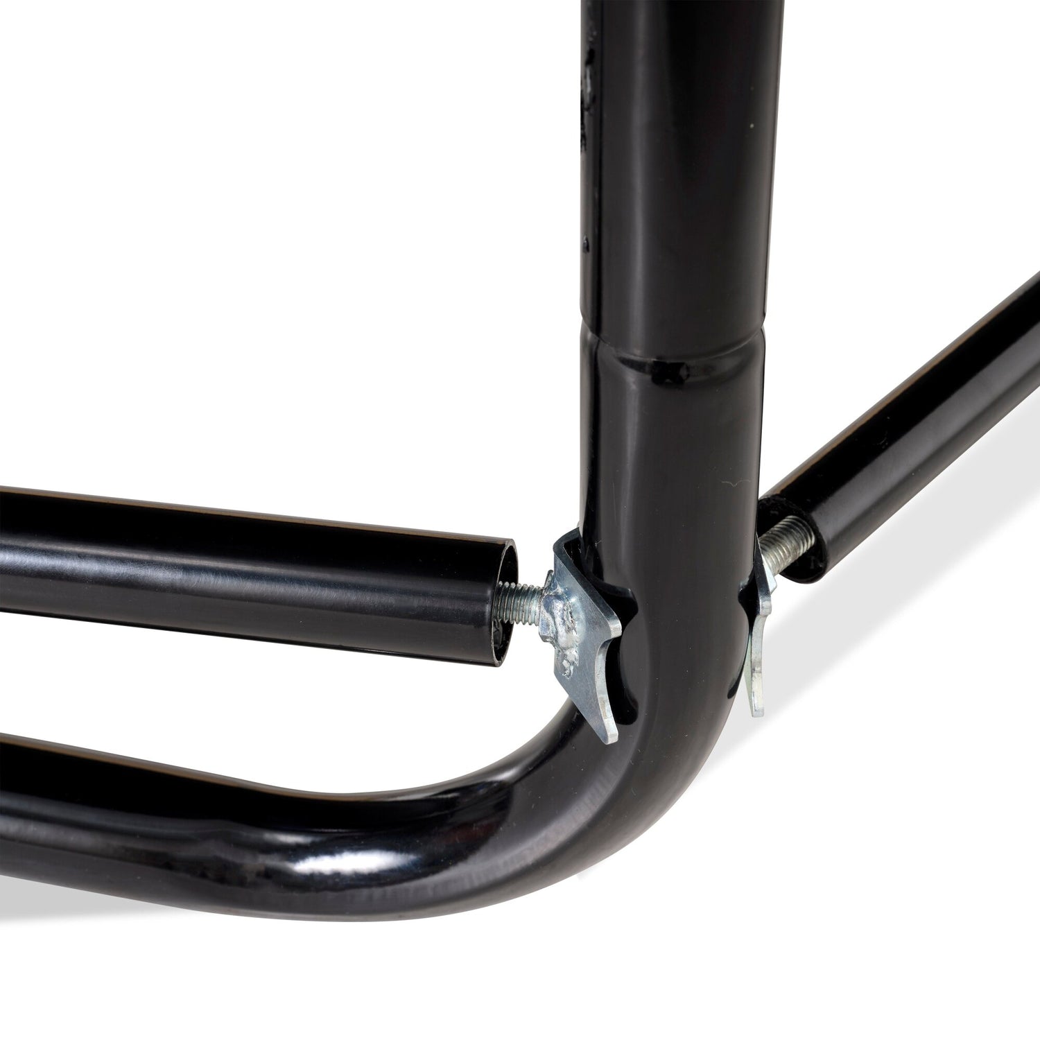 The EXIT robot mower stop L is an obstruction piece which attaches to the trampolines, so that the robot mower can mow the grass around the trampoline without hitting the trampoline. The stop consists of a metal tube with screw thread which clamps between the legs of the trampoline.