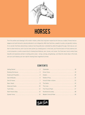 With this step-by-step book, Walter Foster renders a variety of horse breeds in pencil and provides tips on adding touches with charcoal, crayon, and brush and ink. He explains not only a number of drawing techniques and special effects but also his own method of developing a drawing. You will learn about various horse breeds—including quarter horse, Clydesdale, Arabian, and Shetland pony—and their proportions, starting with their heads and then progressing to full bodies.