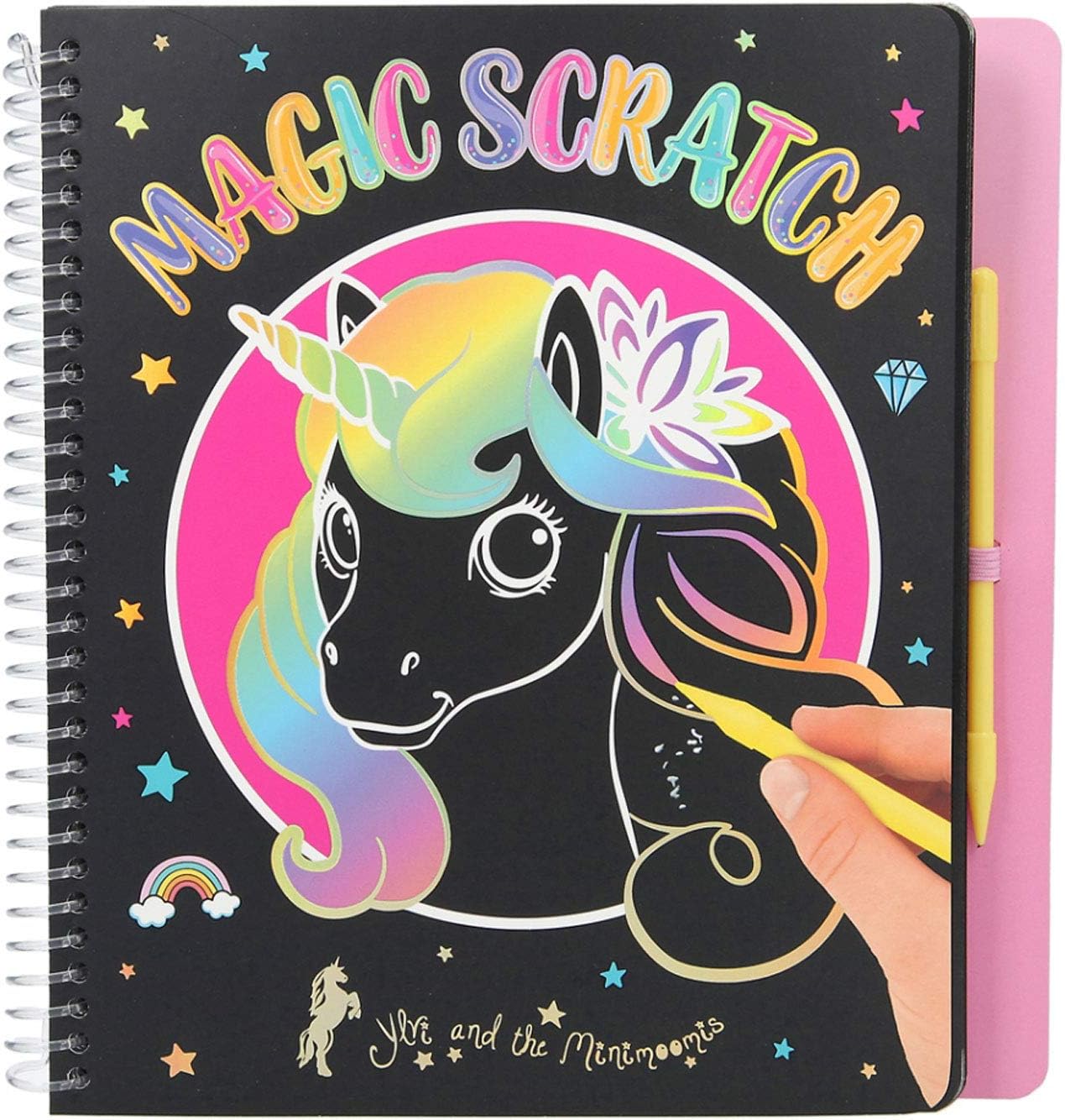 A magical colour spectacle: In the Magic Scratch by Ylvi and the Minimoomis, a colourful world full of unicorns and other cute creatures is created step by step on the black pages with every stroke of the accompanying scratch pen.